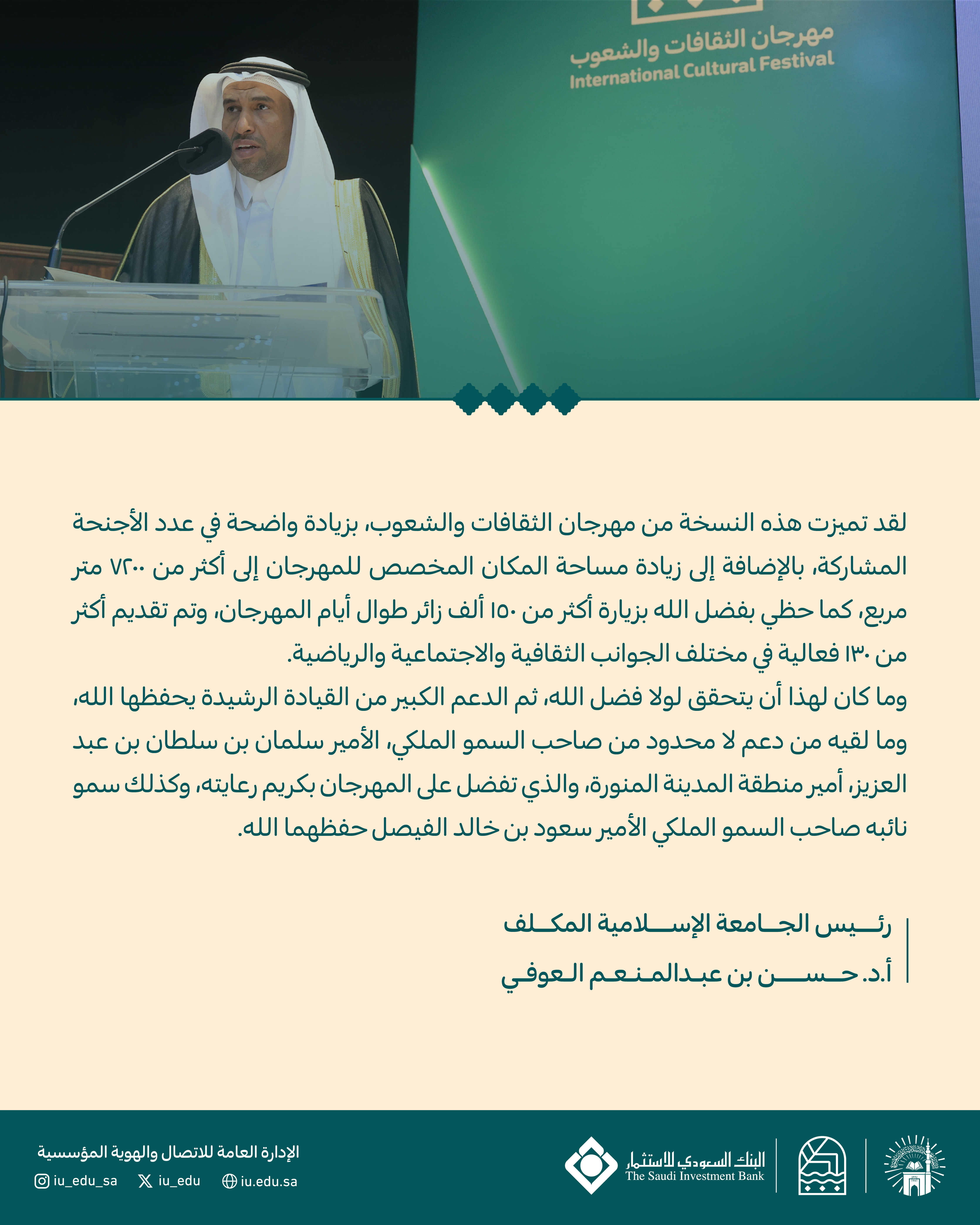 رعى سعادة رئيس الجامعة الإسلامية المكلف أ. د. حسن بن عبدالمنعم العوفي، الحفل الختامي لـ مهرجان الثقافات والشعوب الثاني عشر، والذي استمر لأحد عشر يومًا، شهد فيها العديد من الفعاليات والأنشطة، لكافة أفراد المجتمع.