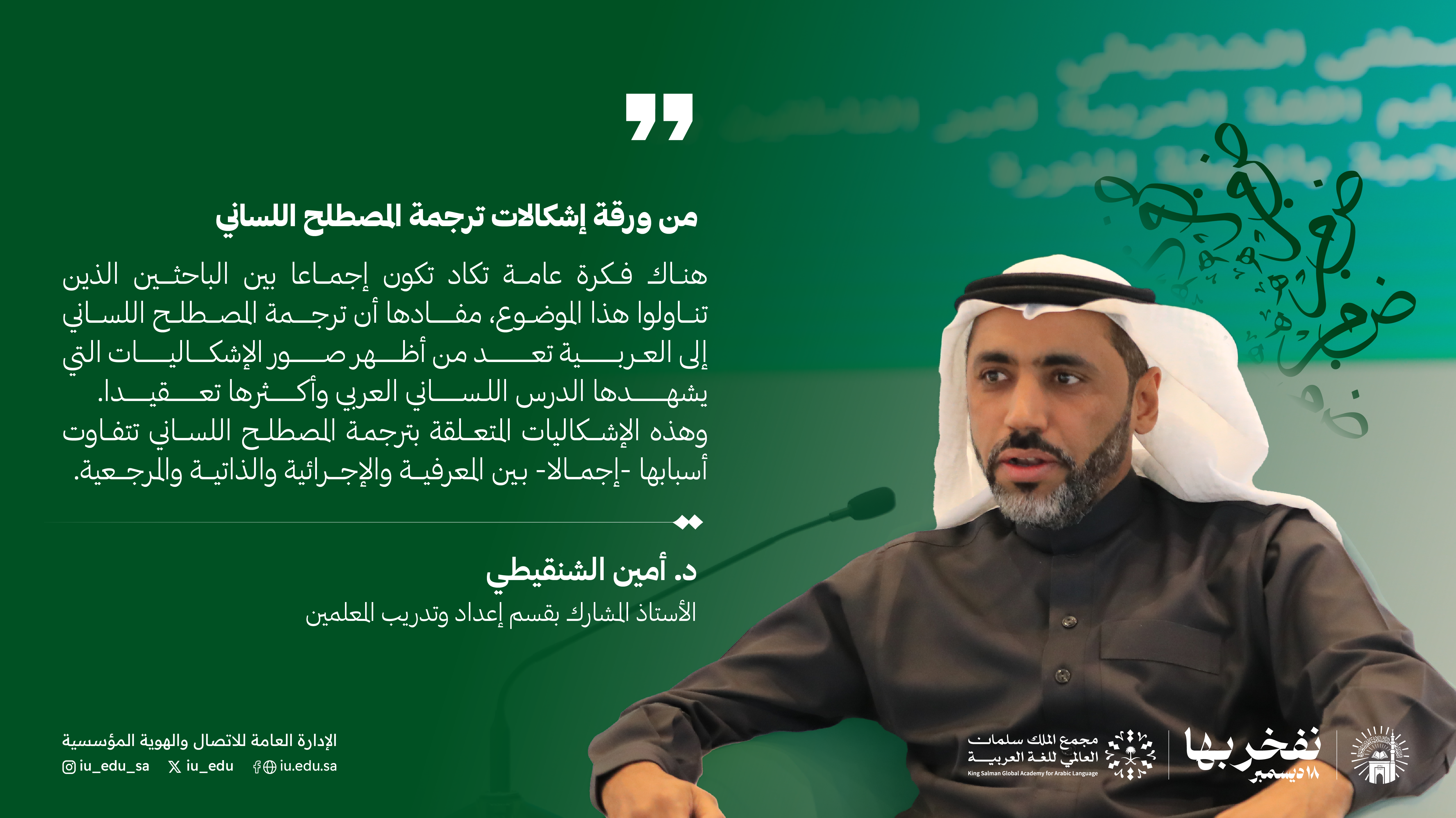 أقامت الجامعة الإسلامية ممثلة بكلية اللغة العربية والعلوم الإنسانية اليوم، ندوة اليوم العالمي للغة العربية، وذلك بالتعاون مع مجْمع الملك سلمان العالمي للغة العربية.