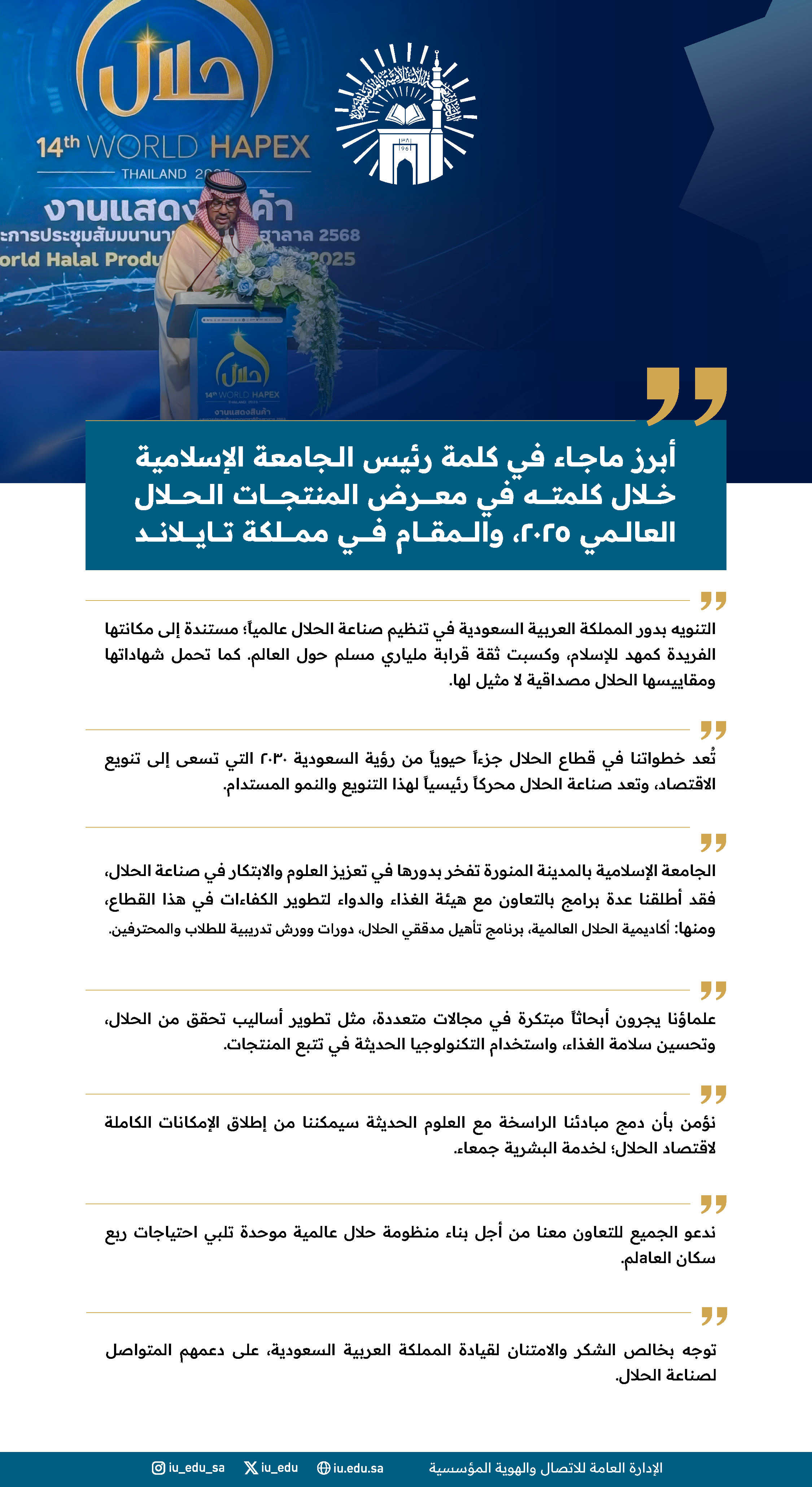 شارك رئيس الجامعة الإسلامية د. صالح بن علي العقلا كمتحدث رئيسي عن (سياسة الجامعة الإسلامية بالمدينة المنورة نحو العلوم والابتكارات للحلال)، في معرض المنتجات الحلال العالمي 2025، والمقام في مملكة تايلاند في الفترة 31 يوليو حتى 3 أغسطس 2025م, بتنظيم معهد حلال بجامعة الأمير سونكلا.