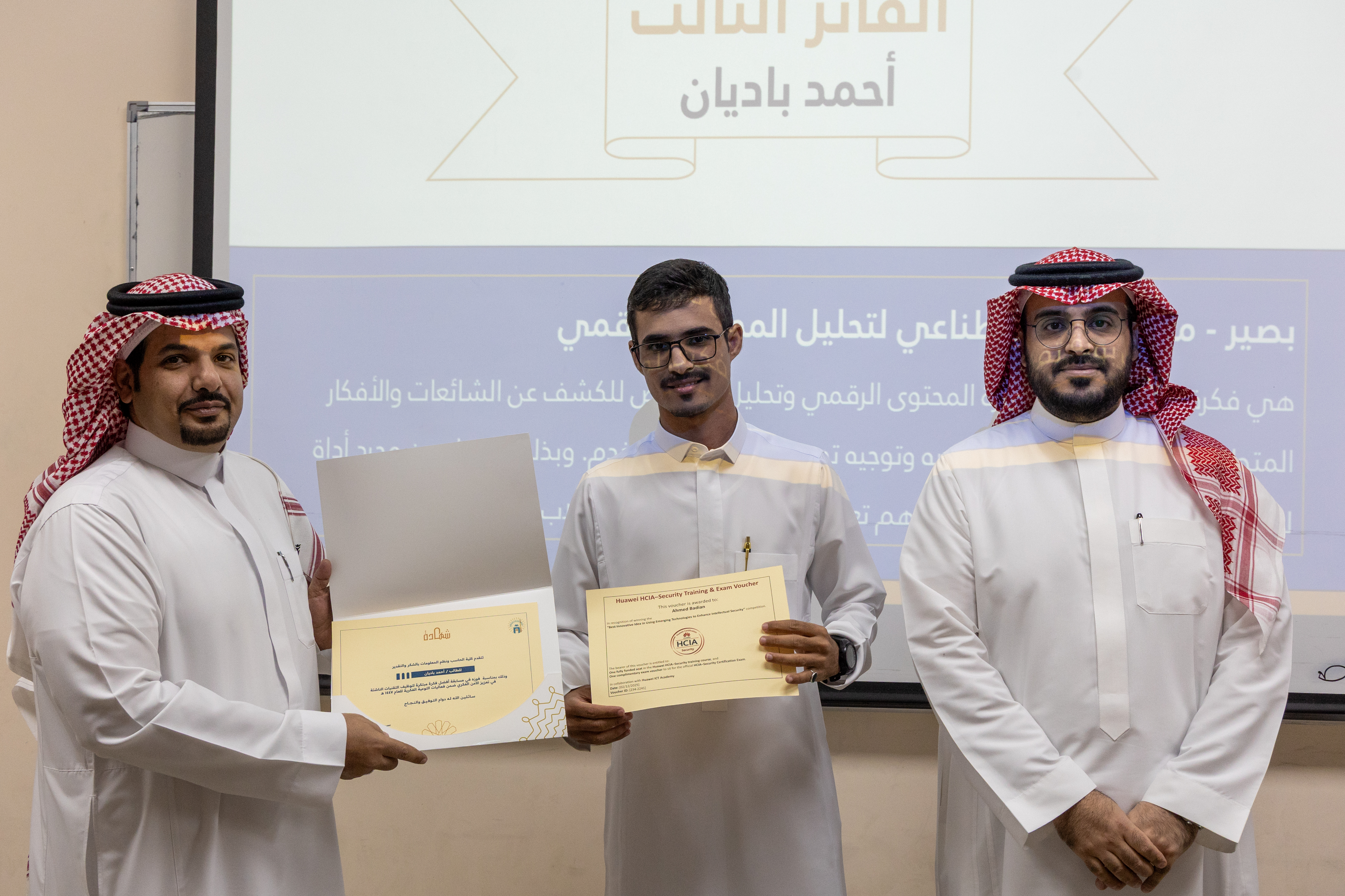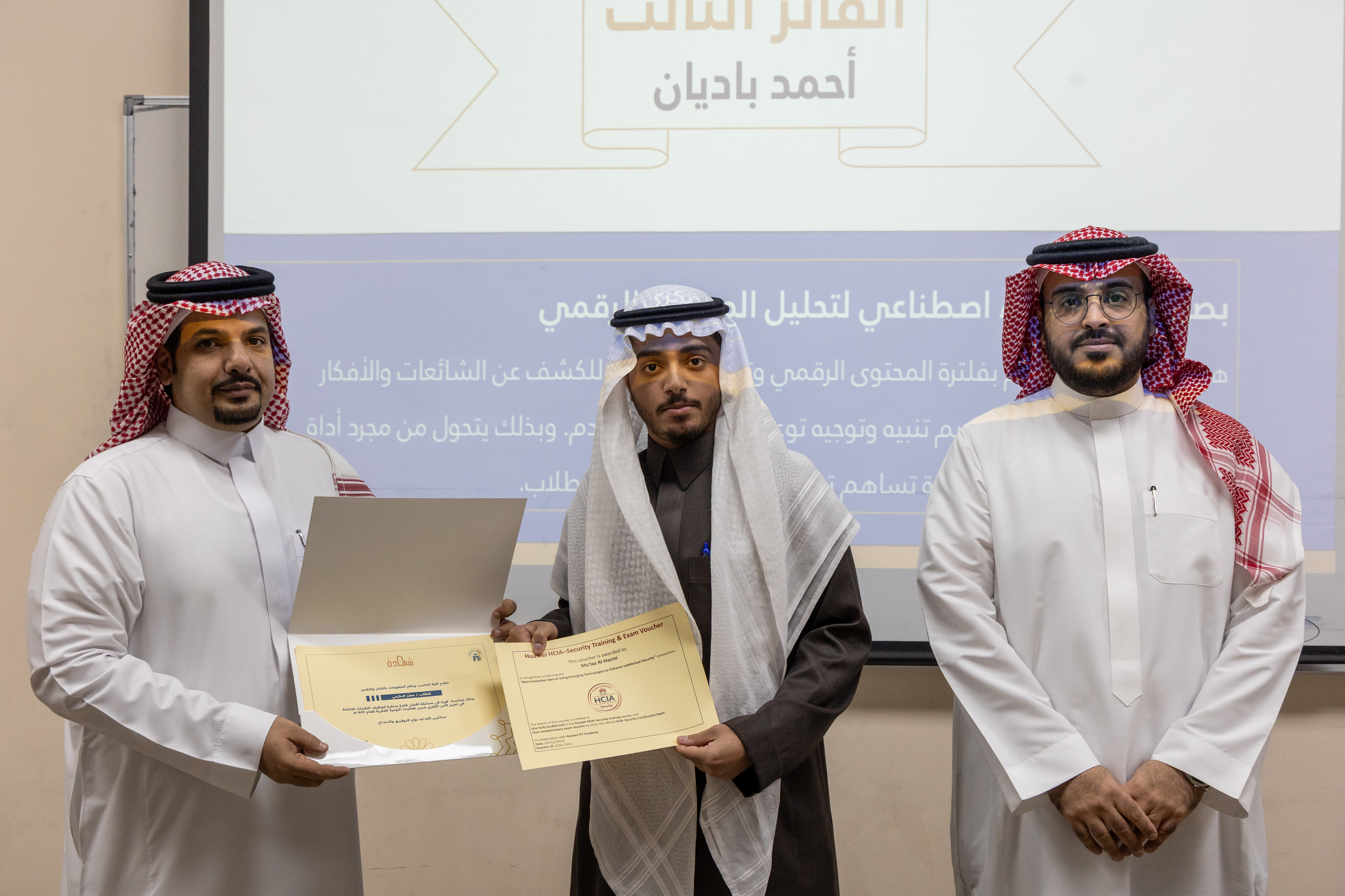 كما تم إعلان الفائزين وتكريمهم من قِبل سعادة عميد الكلية أ.د. تركي الغامدي، بحضور عددٍ من أعضاء هيئة التدريس والطلاب.