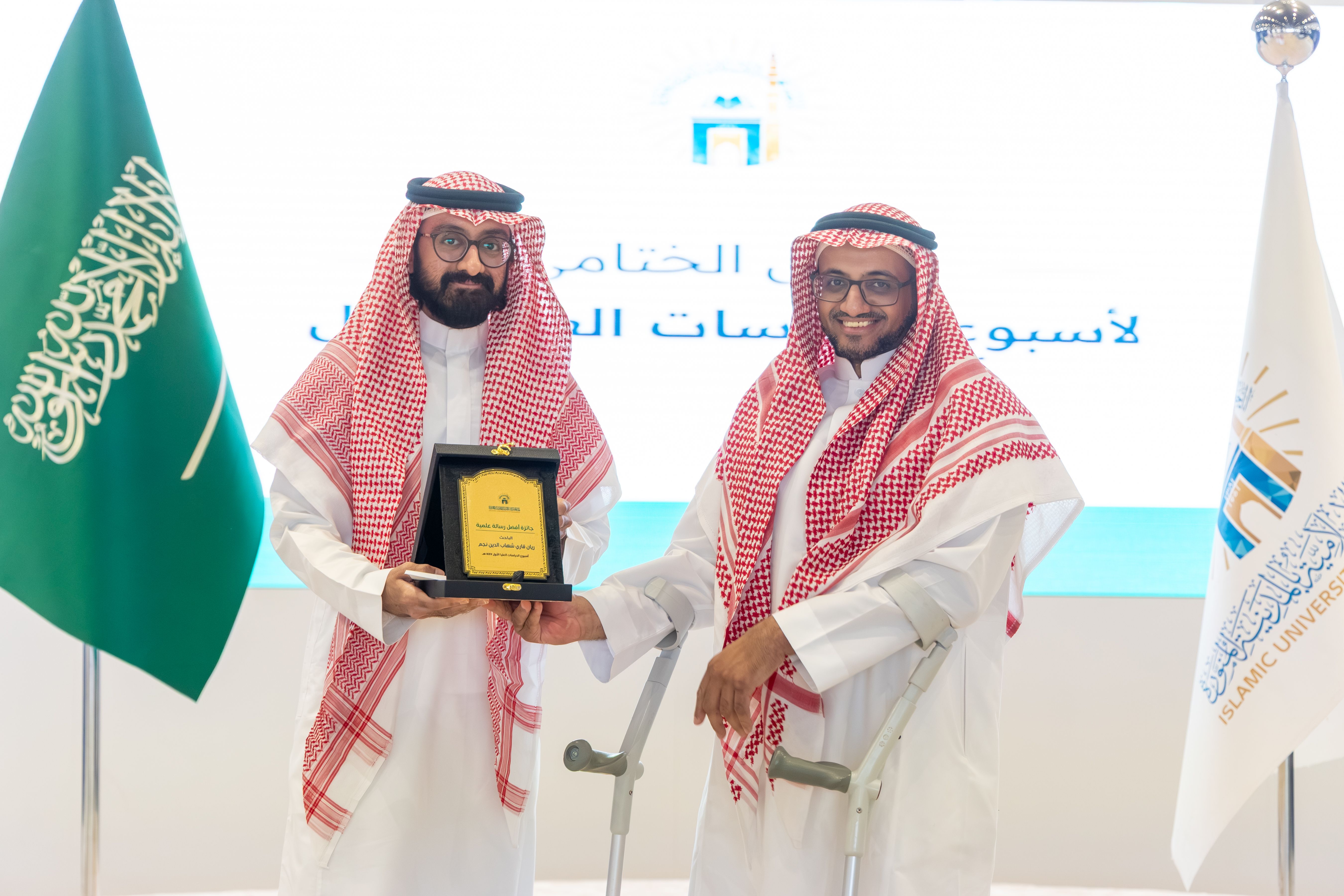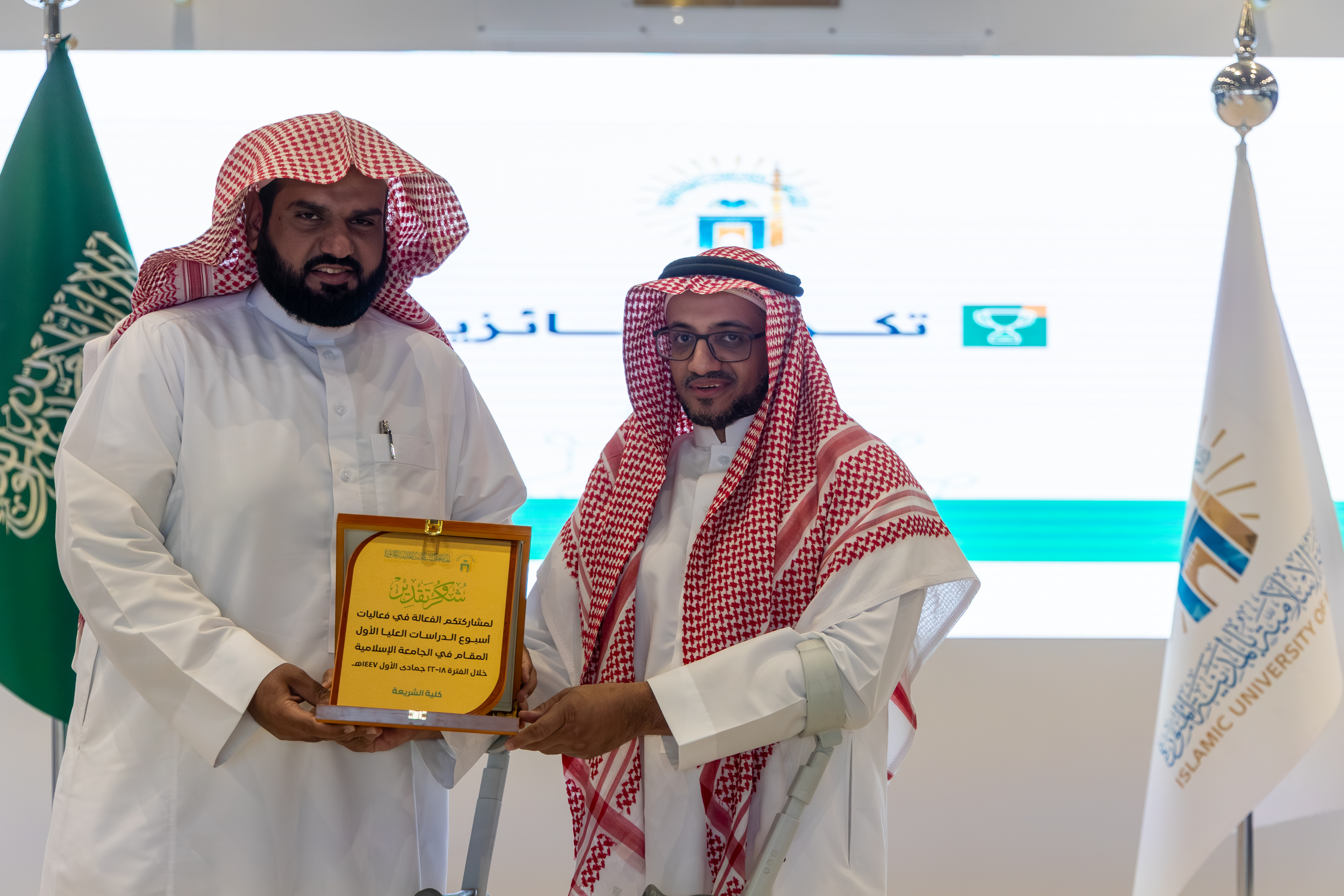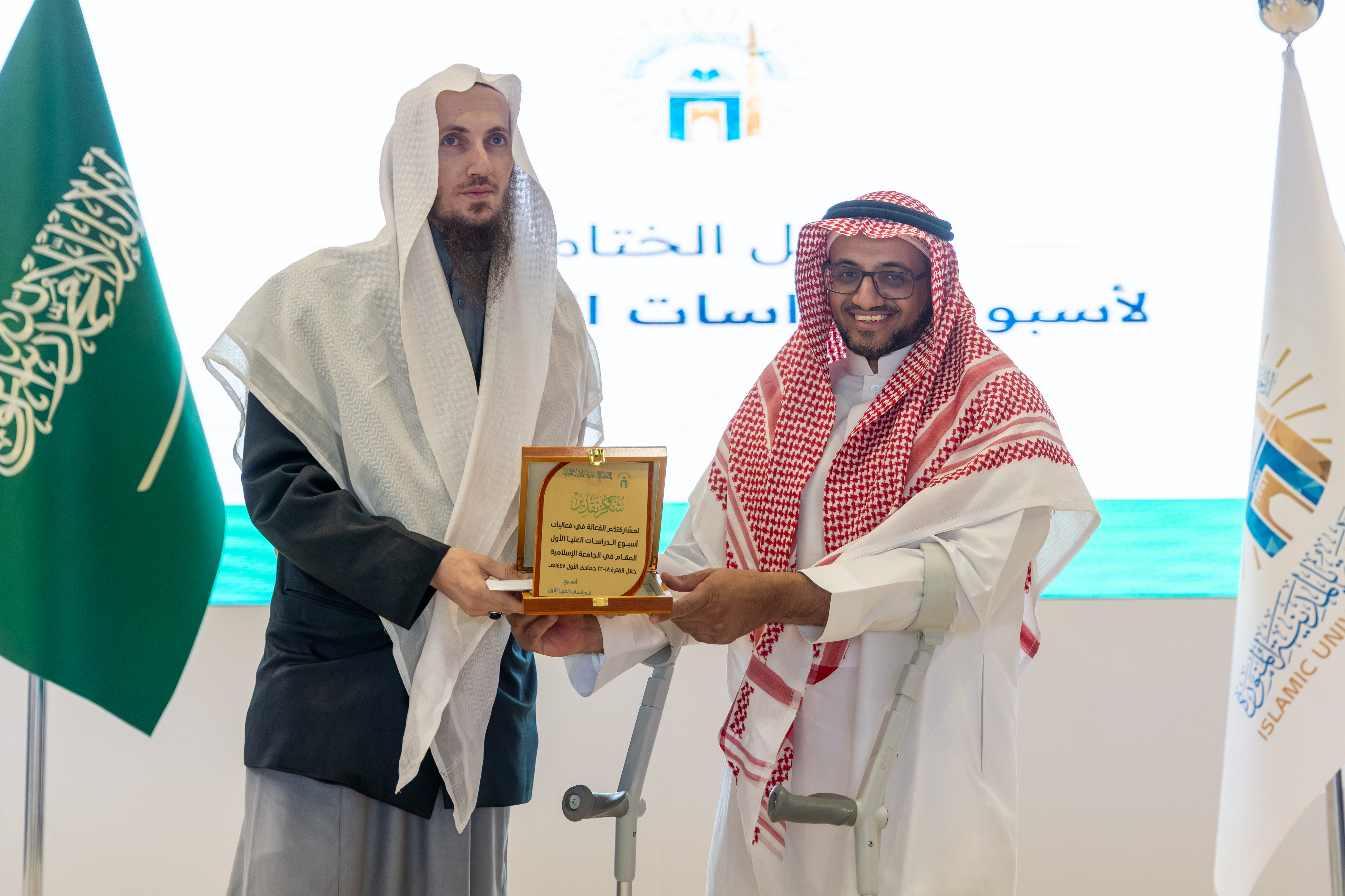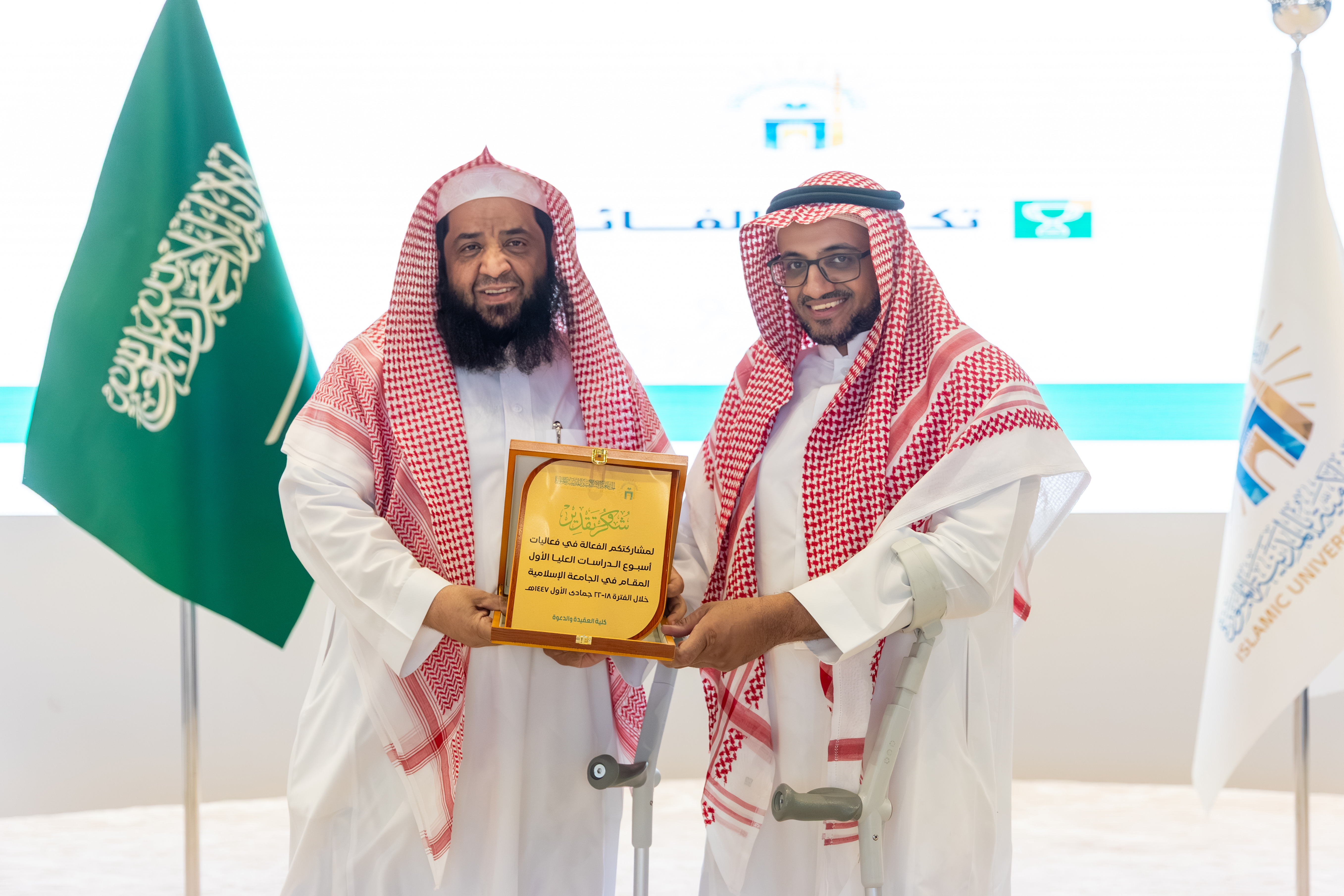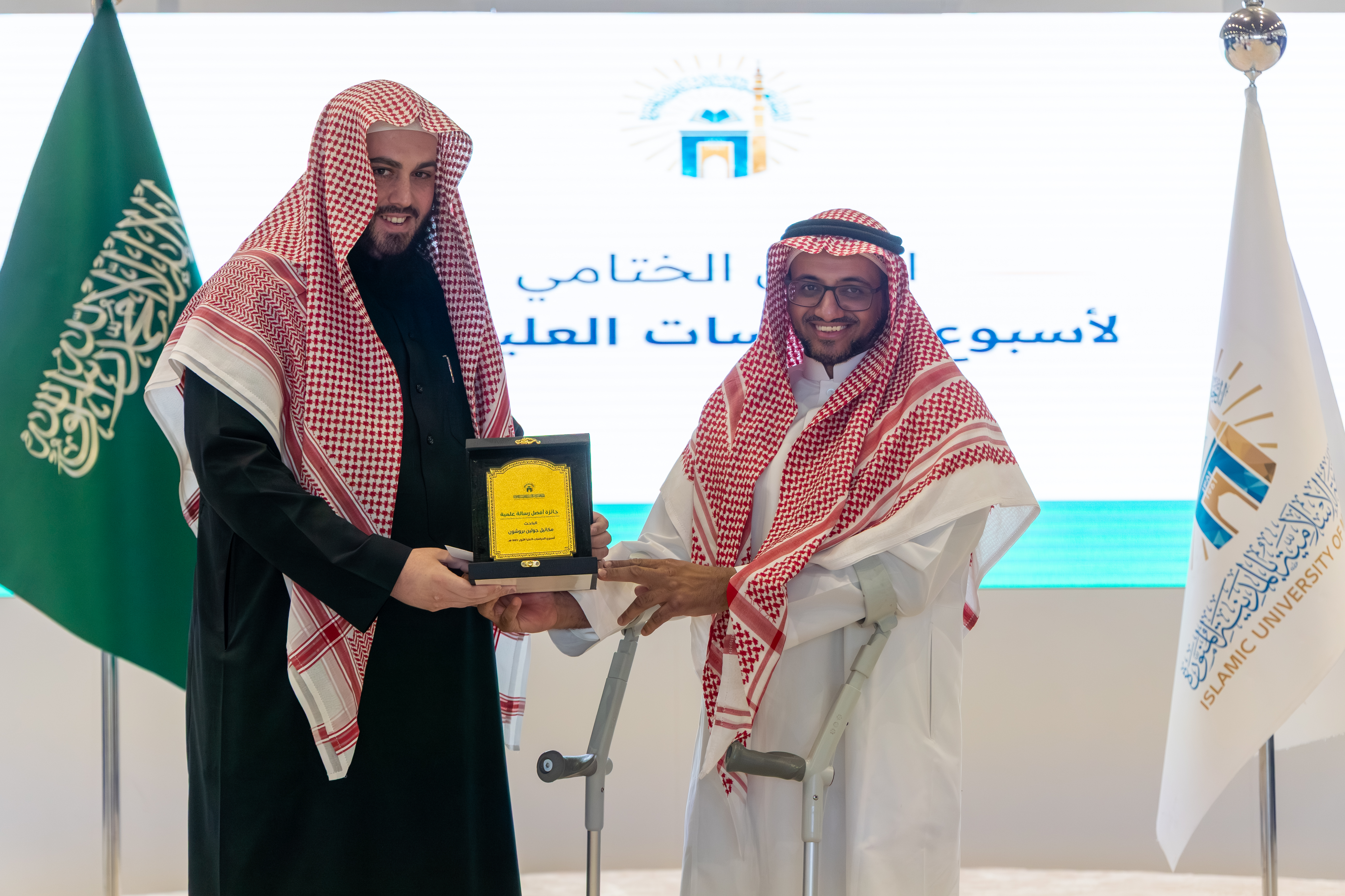 وشهد الحفل كذلك تكريم الفائزين بجائزة أفضل رسالة علمية في كليات: الشريعة، القرآن، العقيدة، القانون، الحاسب، الهندسة، والعلوم، إضافة إلى تكريم الطلاب الفاعلين من نادي الدراسات العليا تقديرًا لإسهاماتهم في نجاح الأسبوع.