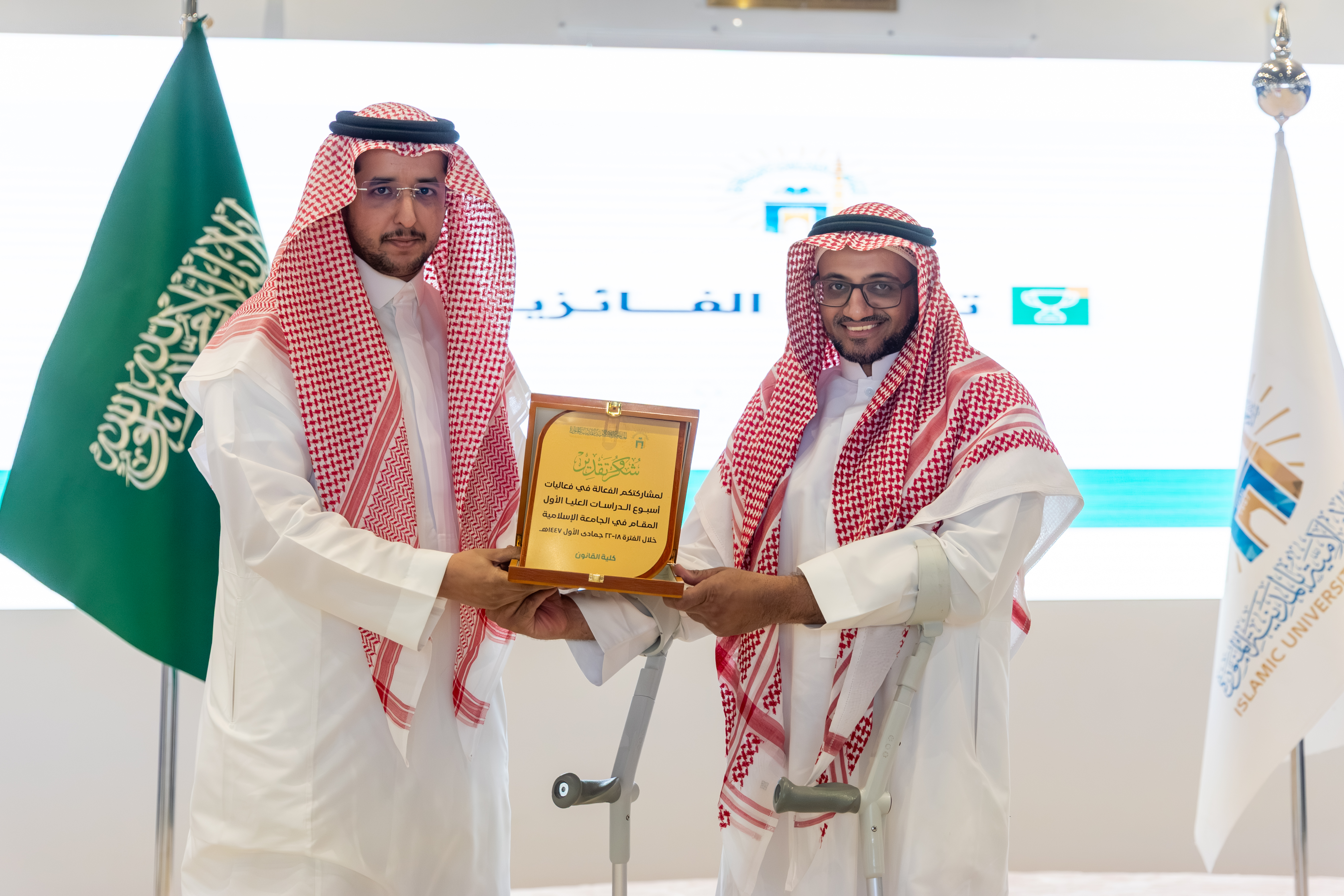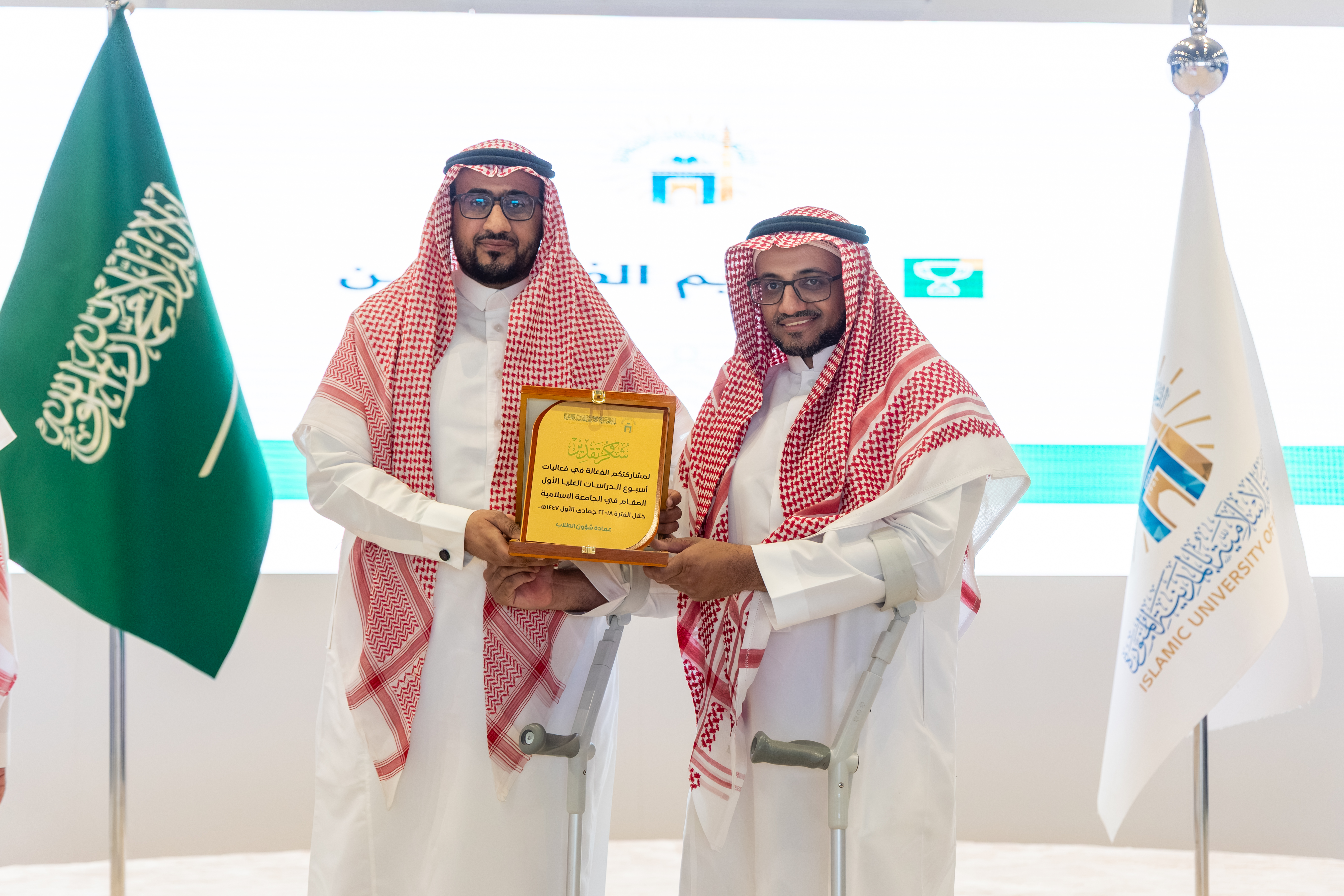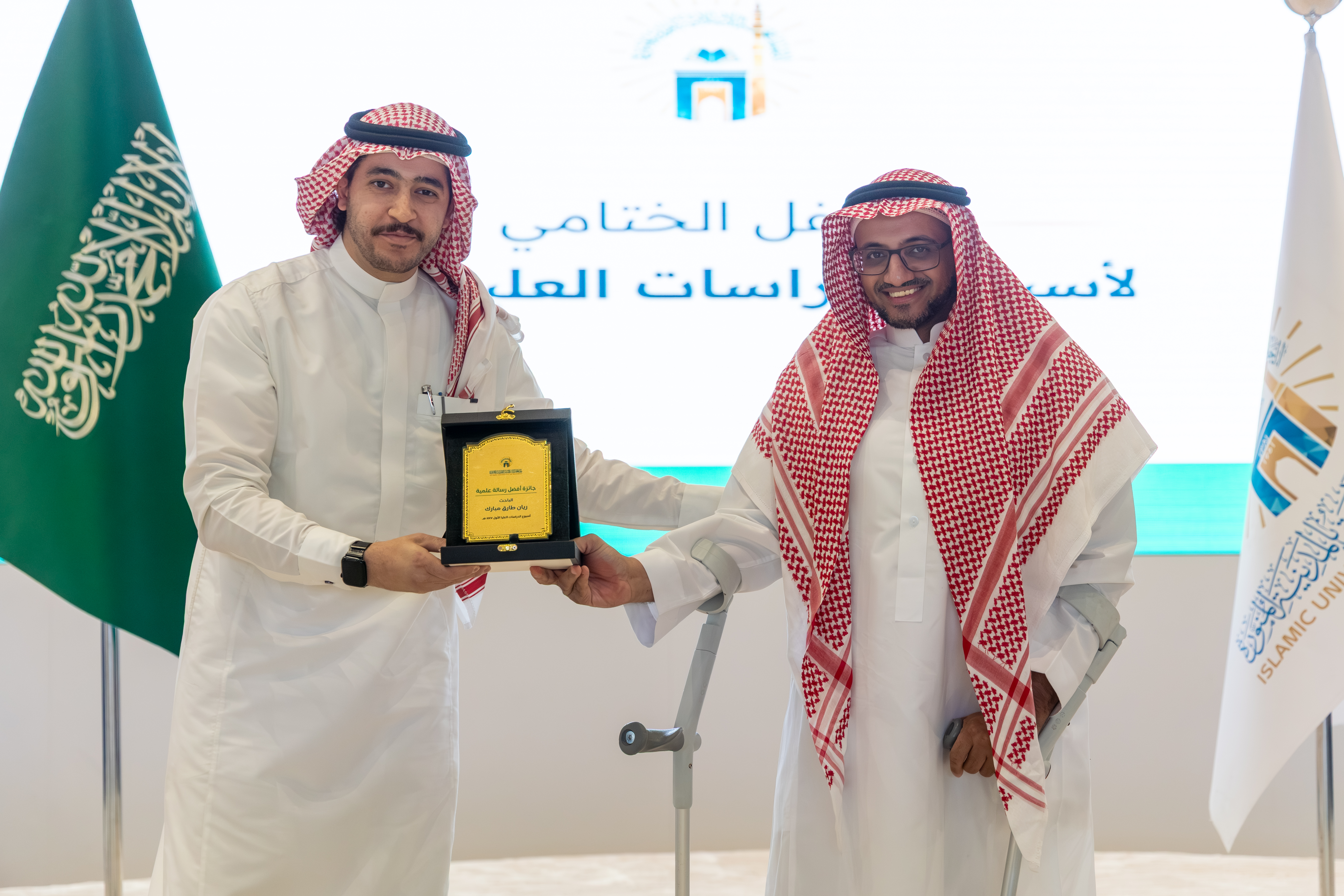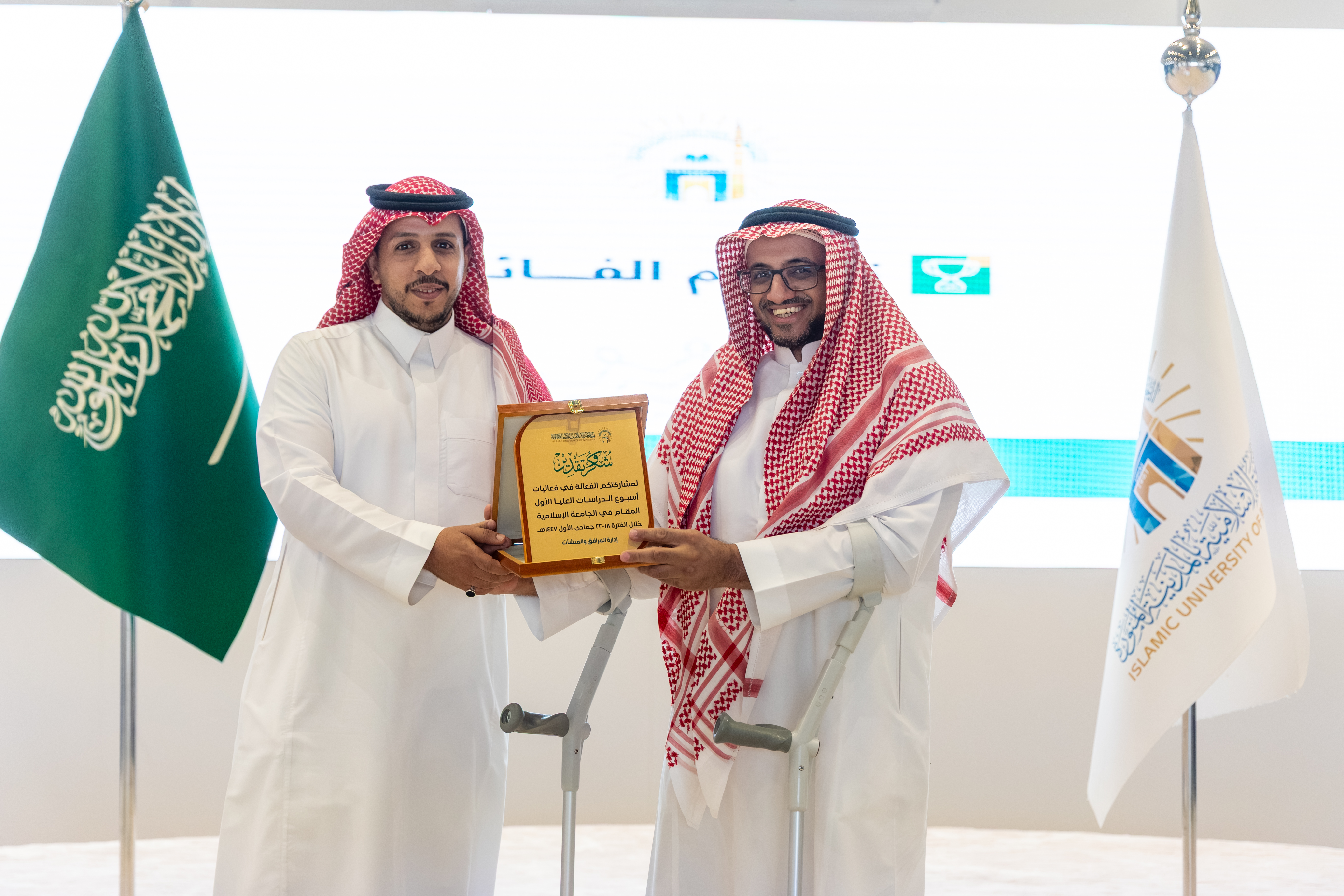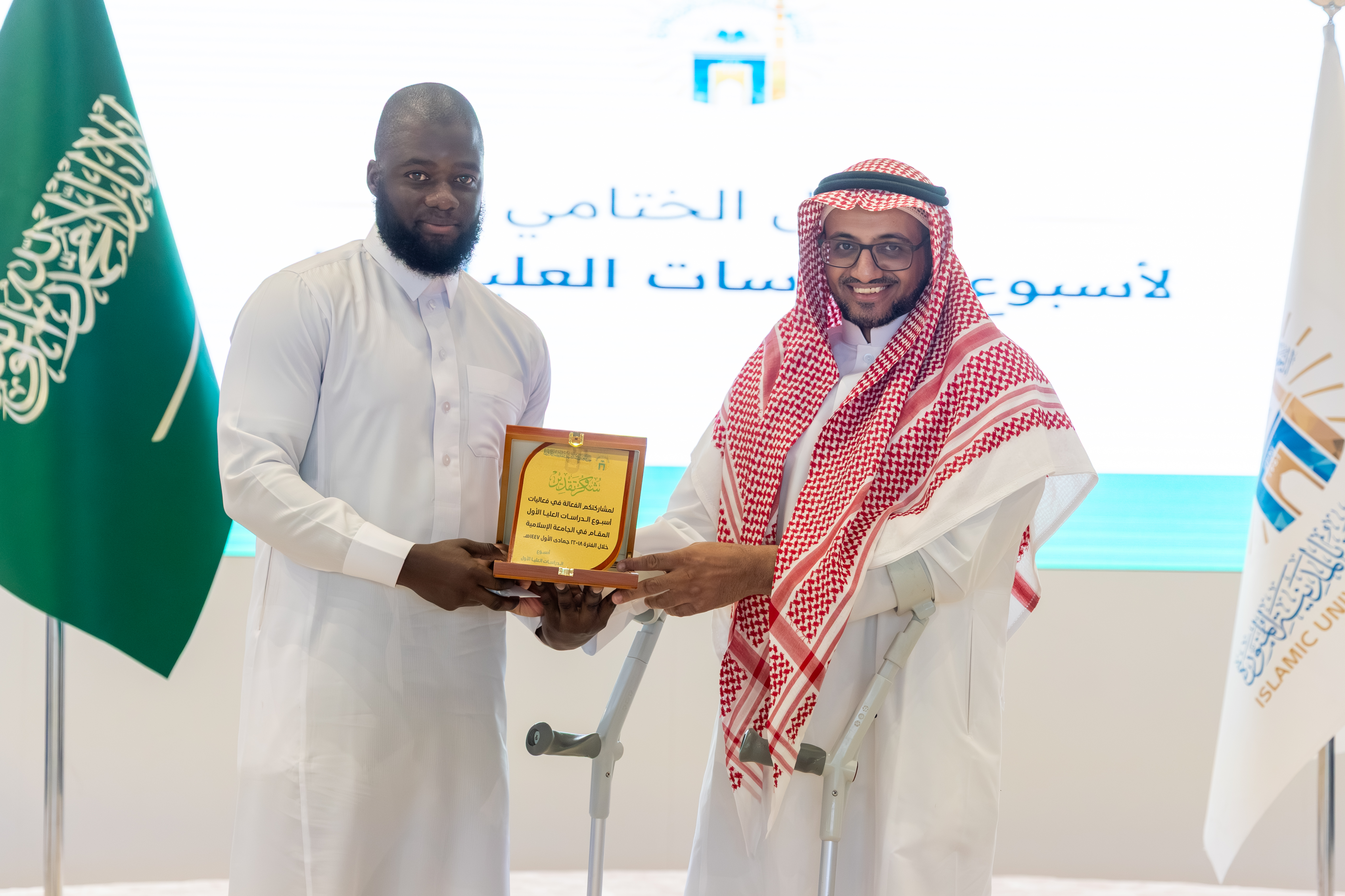 وشهد الحفل كذلك تكريم الفائزين بجائزة أفضل رسالة علمية في كليات: الشريعة، القرآن، العقيدة، القانون، الحاسب، الهندسة، والعلوم، إضافة إلى تكريم الطلاب الفاعلين من نادي الدراسات العليا تقديرًا لإسهاماتهم في نجاح الأسبوع.