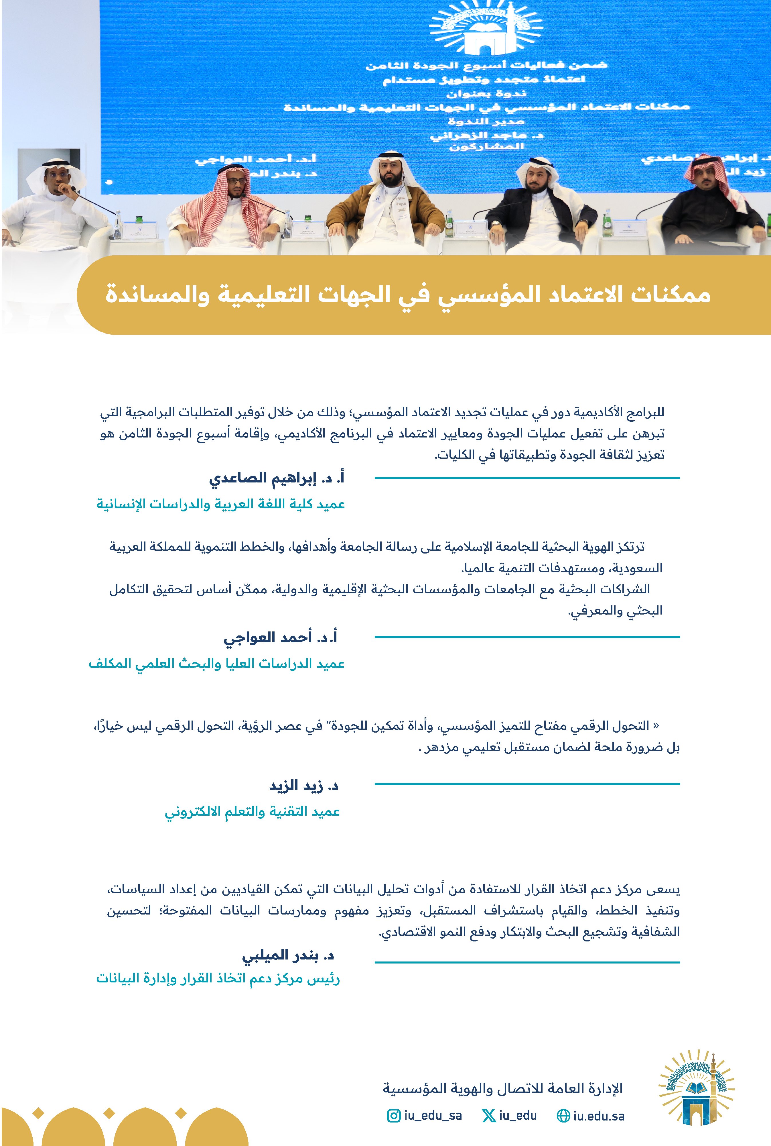 نظمت الجامعة الإسلامية، ممثلة بعمادة التطوير والجودة، ندوة بعنوان: "ممكنات الاعتماد المؤسسي في الجهات التعليمية والمساندة " ضمن فعاليات أسبوع الجودة الثامن "اعتمادٌ متجدد، وتطويرٌ مستدام".