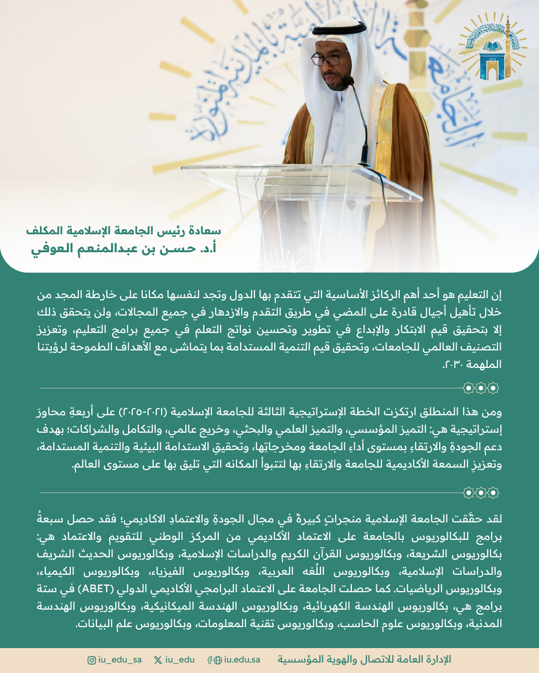 وتم توقيع اتفاقية تجديد الاعتماد المؤسسي وتوقيع اتفاقية اعتماد 24 برنامجًا من برامج الجامعة الإسلامية، بحضور معالي رئيس مجلس إدارة الهيئة الدكتور خالد بن عبدالله السبتي، والأستاذ الدكتور حسن بن عبدالمنعم العوفي رئيس الجامعة المكلف.