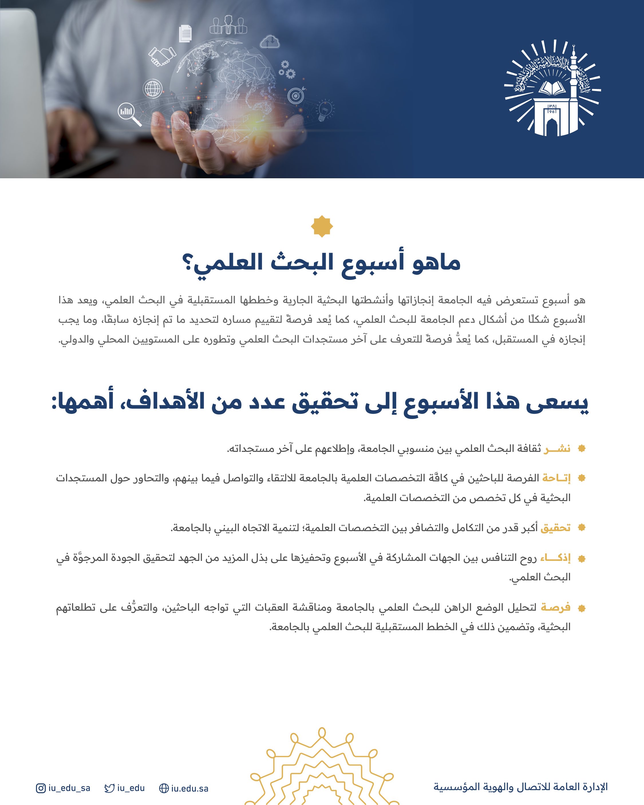 دشن سمو رئيس الجامعة الإسلامية أ. د. ممدوح بن سعود بن ثنيان آل سعود فعاليات وأنشطة أسبوع البحث العلمي الرابع في الجامعة الإسلامية، والذي يهدف إلى نشر ثقافة البحث العلمي، وإتاحة الفرصة للباحثين للالتقاء والتواصل فيما بينهم.