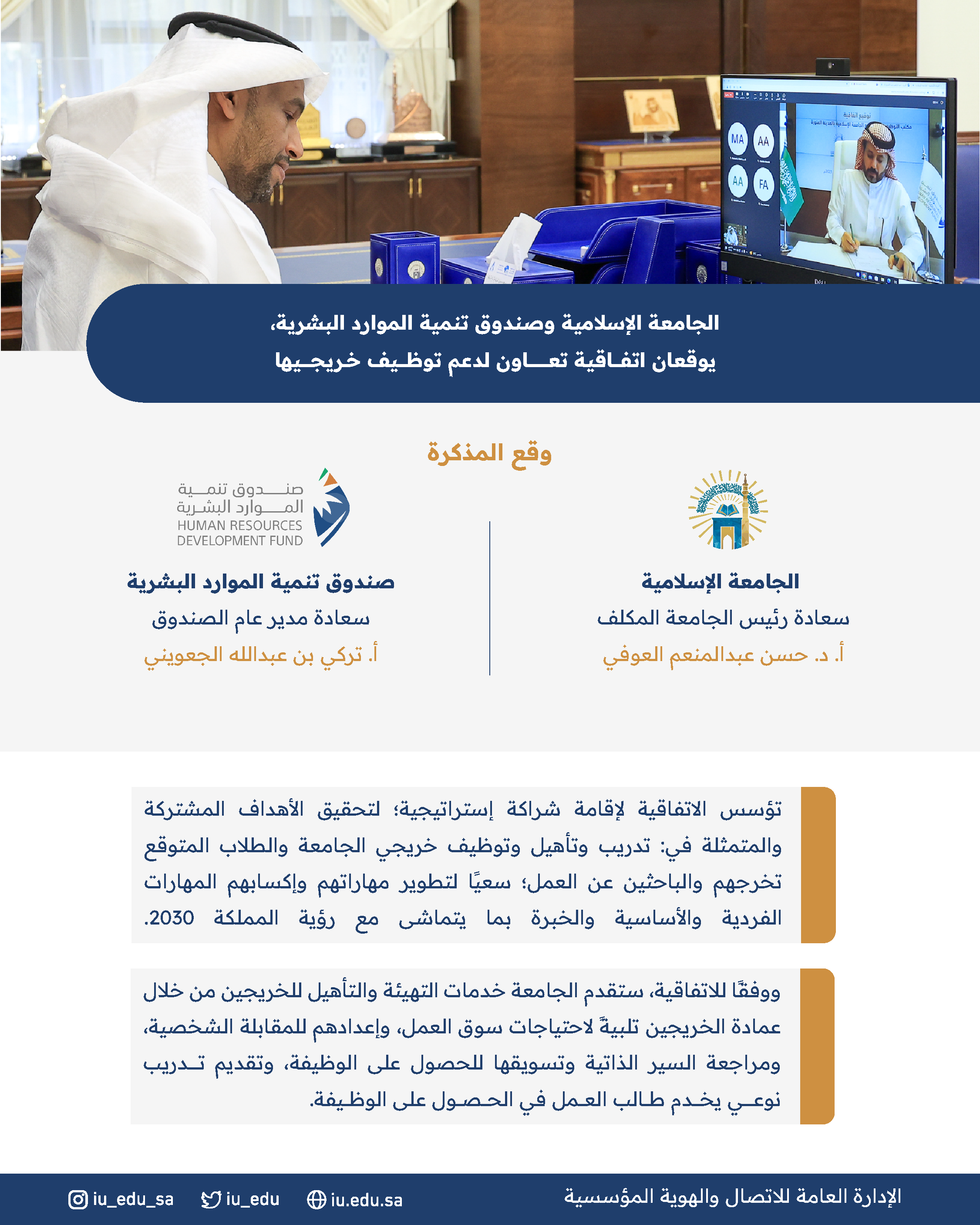 أبرمت الجامعة الإسلامية بالمدينة المنورة؛ اتفاقية تعاون مع صندوق تنمية الموارد البشرية لدعم توظيف خريجي الجامعة والطلاب المتوقع تخرجهم، بهدف زيادة قدرتهم التنافسية في سوق العمل ورفع نسبة التوظيف، وذلك ضمن مبادرة الصندوق في برنامج دعم مكاتب توظيف الخريجين بالجامعات.
